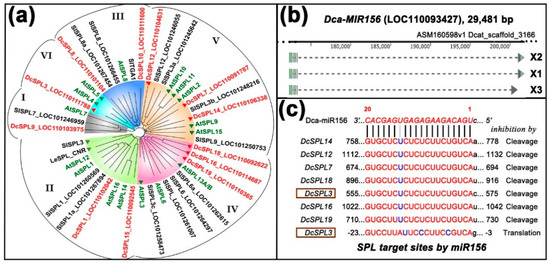 A homology search with Arabidopsis and tomato sequences identified 12 SPL genes (annotated as SPL1, 3, 7, 8, 9, 10, 12, 14, 15, 16, 18, and 19, by the genome project) and one precursor gene of miR156 in D. catenatum (Figure 2a,b). We grouped the proteins together with those from Arabidopsis and tomato into six clades using alignment with full-length amino-acid sequence, rather than with their nucleotide sequences [44]. The predicted miR156-targeted SPLs could be placed within the IV, V, and VI clades (Figure 2a), suggesting a functional similarity at the protein level. Pairing with the 20-nt sequence of miR156 with its seven target SPL transcripts, as predicted by the online tool psRNATarget, http://plantgrn.noble.org/psRNATarget/, revealed only a mismatch in six mRNAs except DcSPL3, in which the target sequence exhibited three mismatches, suggesting a repression either by transcription cleavage or translation inhibition, or both (Figure 2c).