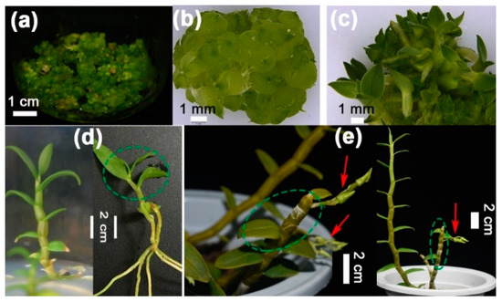 D. catenatum plants in the three developmental stages. (a) Protocorm clusts on proliferation medium (½ MS + 0.269 μM NAA + 2.22 μM BA + 5% potato pulp + 2.5% sucrose); (b) proliferating protocorms on proliferation medium; (c) differentiating protocorms at 40 days on germination medium (½ MS +2.69 μM NAA +5% banana pulp + 3% sucrose); (d) one-year-old young plants in juvenile stage which were incapable of flowering; (e) adult three-year-old plants cultured in pots. Red arrows indicate the lateral floral bud sets. Green circles indicate sampling positions for RNA isolation from leaves and stems.