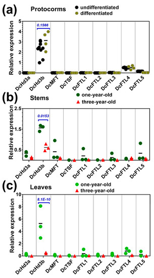Profiling the FT/TFL1 gene expression showed that, in the protocorms, either undifferentiated or at earlier differentiating stage, DcHd3b is the most expressed among the FT/TFL1 genes, followed by DcFTL4 (~5.5-fold lower than DcHd3b) and DcFTL5 (~17-fold lower than DcHd3b). Transcripts of other FT/TFL genes were barely detectable (Figure 4a). No significant change in the expression of FT/TFL1 genes was found during early differentiation of the protocorms, e.g., until leaf primordium opening (Figure 3c). Notably, DcHd3b also showed much higher expression in young juvenile plants. Its mRNA levels were approximately 13.5-fold and 2.6-fold higher in leaves and stems of young plants compared to adult plants, respectively (Figure 4b,c).