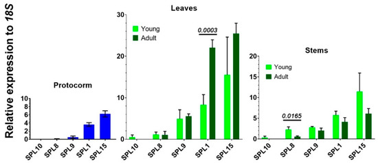 Expression profiles of five SPLs that were not targeted by miR156 in protocorms, leaves, and stems. Error bars represent the SD for at least three biological replicates. For statistical significance, the adjusted p-values are given on top of the bars.