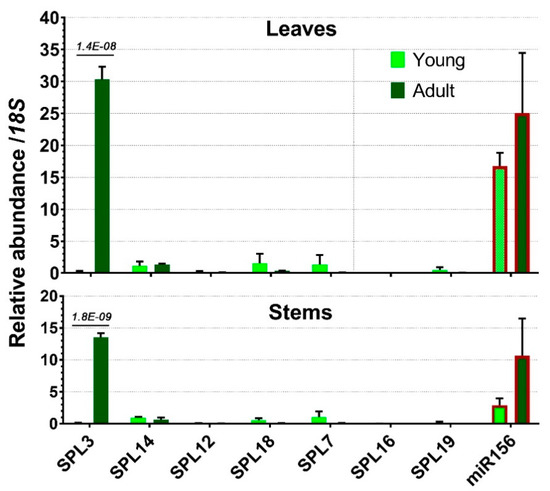 Except for SPL3, all the other targeted SPLs displayed very low expression levels in adult leaves or stems (Figure 7). Slightly increased expression in young tissues was observed for SPL7 and SPL18, but these little difference in expression levels could not possibly explain their roles in juvenile phase change.