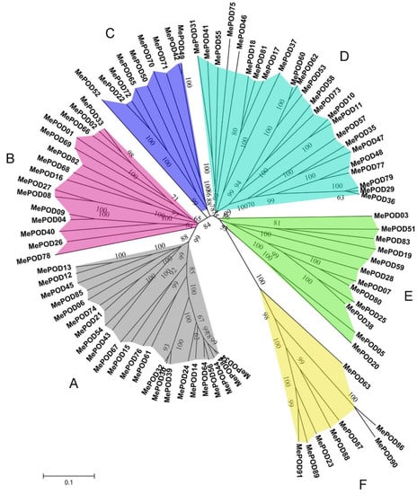 The homology and similarity of the POD genes in cassava were determined by performing multiple sequence alignments. Then, the radiation phylogenetic tree of the 91 POD genes was constructed using the neighbor-joining (NJ) method with a bootstrap value of 1000 using MEGA 5.1 (University College Dublin, Dublin, Ireland). The phylogenetic analyses indicated that MePOD genes can be divided into six subgroups on the basis of the observed genetic distance and bootstrap support (Figure 1). The large subgroups A and D consist of 23 and 24 MePOD members, respectively, whereas the small subgroups C and F contain 9 and 8 MePOD members, respectively. Subgroups B and E are composed of 15 and 12 MePODs members, respectively. These results show that a diversified POD family exists in cassava.