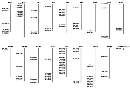 The locations of the cassava POD genes were determined by analyzing their chromosomal distribution (Figure 4). The 91 MePODs were mapped to chr1, 2, 3, 4, 5, 6, 7, 8, 9, 10, 11, 12, 13, 15, 16, 17, and 18, and scaffold01119. The 24 POD genes in subgroup D were distributed among chr1, 2, 3, 5, 6, 8, 11, 12, 13, 15, 16, and 17, making subgroup D the most widely distributed subgroup. Subgroup F contains eight POD genes, which are located on chr1, 2, 4, 8, 11, 16, and 18; thus, of the six subgroups identified, subgroup F is dispersed among the fewest chromosomes. The 23 members of subgroup A are found on chr1, 2, 7, 8, 9, 10, 15, 17, and 18, among which chromosomes 7, 9, and 10 only contain subgroup A genes. Generally, the cassava POD genes are widely distributed among chromosomes.