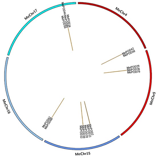 To further investigate the expansion of POD genes in cassava, we aligned the total nucleotide sequences of the 91 MePOD genes to identify duplication events. We identified 15 events involving 16 paralogs (MePOD2/MePOD33, MePOD29/36/79, MePOD30/32/39, MePOD34/44/56/84, MePOD42/MePOD49, MePOD60/MePOD62), suggesting that tandem duplication played a significant role in POD family expansion in the cassava genome (Figure 5).