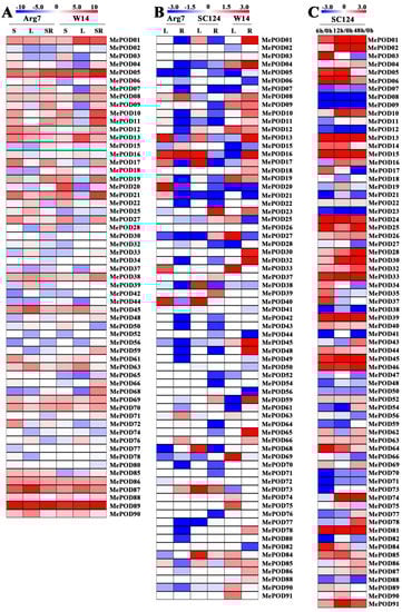 Transcriptomic analysis of cassava POD genes. (A) Expression of MePODs in the stem (S), leaf (L), and storage root (SR) of W14 and Arg7. The log2-based FPKM value was applied to build the heat map using Mev4.9.0 software (CCCB, Boston, USA). (B) Expression of MePODs in the leaf (L) and root (R) of Arg7, SC124, and W14 after drought treatment relative to under normal conditions. Log2-based fold changes (L/control; R/control) were applied to build the heat map using Mev4.9.0 software. (C) Expression of MePODs in the storage root at 6, 12, and 48 h relative to 0 h after harvest. Log2-based fold changes were applied to build the heat map using Mev4.9.0 software.