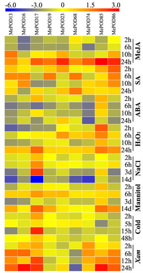 To test the transcription of MePOD genes upon exposure to methyl jasmonate (MeJA), salicylic acid (SA), abscisic acid (ABA), H2O2, salt, osmotic stress (by mannitol treatment), cold stress, and Xanthomonas axonopodis pv manihotis (Xam), nine genes (MePOD-13, -16, -17, -19, -23, -68, -74, -85, -86) that were induced by drought stress in at least two tissues in all three varieties were selected for quantitative real-time PCR (qRT-PCR) analysis (Figure 7; Table S6). We define upregulation as: log2-based fold change > 1. With MeJA treatment, the expression of eight genes (MePOD-13, -17, -19, -23, -68, -74, -85, and -86) was induced, with particularly high levels expressed 24 h after treatment. ABA treatment resulted in increased transcript levels of MePOD-17 and -85. With SA treatment, the expression levels of MePOD-13, -16, -19, -23, -68, -85, and -86 were amplified. H2O2 treatment led to the induction of MePOD-13, -17, -23, and -85. Salt treatment induced the expression of MePOD17 after two and six hours, and three days of treatment, but the gene was repressed after 14 days of treatment. Under osmotic stress, MePOD-13, -17, -19, -23, -85, and -86 were upregulated, among which MePOD-85 was induced throughout the entire treatment time. In response to cold treatment, MePOD17 was upregulated at 2 and 15 h. Exposure to the pathogen Xam led to the upregulated expression of six POD genes (MePOD-13, -16, -17, -74, -85, and -86) at a minimum of two time points. Together, these results demonstrate that the POD genes of cassava respond to multiple stresses and related signals (Figure 7).