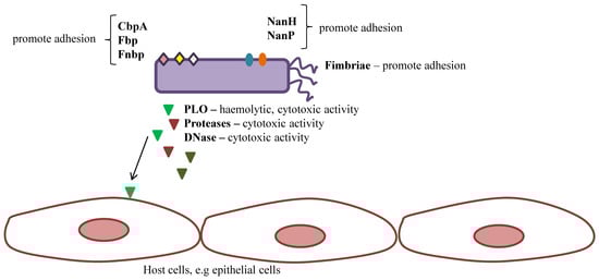 The pathogenicity of T. pyogenes is assigned mainly to PLO, a cholesterol-dependent cytolysin, which promotes cell lysis and is responsible for altering the host cytokine profile. This toxin also exerts cytolytic, dermonecrotic, and lethal effects on numerous types of cells, including immunocompetent and non-immune cells [,]. It is responsible for the complement cascade induction; modulation of the host cytokine profile; inhibition of respiratory burst; and bactericidal activities in neutrophils, monocytes, and macrophages. These features lead to the modulation of the immune response and to evasion from a host’s immune mechanisms. Because of the presence of neuraminidases NanH and NanP, T. pyogenes is able to adhere to the alimentary and respiratory epithelial mucosa, increasing the mucus viscosity that facilitates bacterial colonization and diminishes the host immune response, including damage to a first line of defence—destruction of IgA by bacterial proteases. Those serine proteases, as it was mentioned above, are involved in the invasion and destruction of tissues [,].