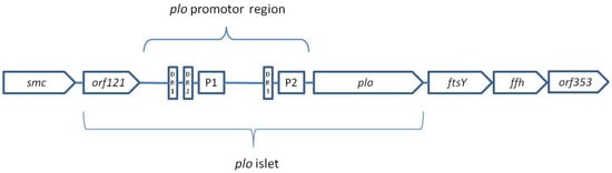 Billington et al. [] cloned and sequenced the plo gene encoding PLO, which was located in an open reading frame (ORF) of 1605 bp in the T. pyogenes chromosom. The plo gene sequence was also described by Ikegami et al. [], for which the deduced pyolysin sequence showed a 99.4% similarity and a 97.6% identity to the PLO sequence previously reported by Billington et al. []. A consensus ribosome binding site, two promoter sequences (similar to the E. coli σ70 promoter), and three direct repeats (DR1 to D3 with sequence ATTTTTG(C)TGG) were found upstream of the plo gene, and a transcriptional terminator region was found downstream of this gene []. Moreover, Rudnick et al. [] found that the plo gene, along with the mentioned sequences and ORF (orf121), encoded a 13.4 kDa protein of an unknown function, form a genomic islet of 2.7 kb, characterized by a reduced content of G+C (50.2%). This islet, flanked by two housekeeping genes, smc and ftsY (62.5% G+C), is located in the T. pyogenes chromosome (Figure 3) []. Interestingly, the codon usage of plo and orf121 differ from that of the genes flanking the islet. The genes smc and ftsY are common in many other bacteria, mainly Gram-positive, and are essential for T. pyogenes viability []. Downstream of the ftsY gene are the ffh gene, and then the ORF, orf353. The ftsY and ffh genes encode the FtsY and Ffh proteins, respectively, which have a high similarity to the signal recognition particles from the other bacterial species []. The ftsY, ffh, and orf353 genes in T. pyogenes are located in close proximity, and form an operon-like arrangement that is unusual in most other bacteria. It seems that, as in other species, these genes are needed for bacterial growth.
