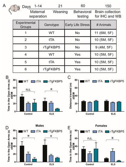 High FK506-binding protein 5 (FKBP5) and early life stress increases anxiety-like behavior. (A) Timeline of experimental protocol and total number of animals per group for each genotype and stress condition. For the maternal separation, mice were separated from their dams for 3 h daily for 14 consecutive days. (B) Total time in open arms and (C) distance traveled during the elevated plus maze (EPM) test. EPM total time spent in open arms by (D) males and (E) females. WT = wild-type, tTA = CamKIIα-tTA, rTgFKBP5 = FKBP5 overexpressing mice, M = males, F = Females, s = seconds, m =meters, ELS = early life stress. Data are represented as standard error of the mean (SEM) and analyzed by three- and two-way Analysis of variance (ANOVA)s (see Table 1 for analysis). Significant results were considered when p < 0.05 and were followed by Bonferroni post hoc tests. * = two-way ANOVA significant difference (p < 0.05) within non-stressed or ELS groups; n.s. = non-significant. MWM = Morris Water Maze.