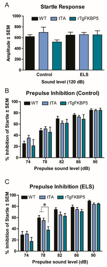 Since sensorimotor gating reflexes are known to be reduced in patients with various neuropsychiatric disorders linked to FKBP5 and stress [21], we tested for any deficiencies in startle habituation (response after repeated presentations of a stimulus) and the prepulse inhibition (PPI, response after previous presentation of a weak stimulus). Startle habituation was similar within all groups (Figure 2A). However, a significant difference within the ELS group was measured by PPI, but only following the 78 dB stimulus (Figure 2B,C). Once again, we found sex differences between the groups. Specifically, the stressed rTgFKBP5 females had lower inhibition of startle (p < 0.05) when compared to the WT and tTA controls (Supplementary Material File S2). Overall, we only found modest changes in the overall startle response and PPI caused by the interaction of ELS and FKBP5 (p > 0.05) (Table 1).