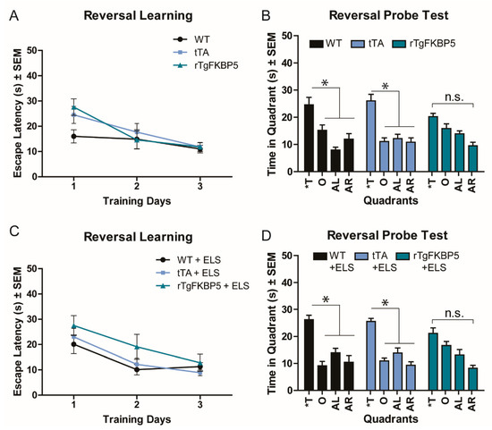 We previously demonstrated that rTgFKBP5 mice have impaired spatial learning and cognitive flexibility using the MWM reversal task [17]. Here, we examined whether ELS could intensify this impairment. We found no difference between the groups in the initial training or probe test (Supplementary Material File S3), except that the rTgFKBP5-ELS mice spent significantly more time in the target quadrant during the Day 5 probe trial than the tTA-ELS, WT-ELS, and non-stressed rTgFKBP5 (Bonferroni post-hoc, p < 0.05). While this result is interesting, all of the groups were able to successfully identify the target quadrant. To test for cognitive flexibility, we relocated the platform in the opposite quadrant. Despite a similar escape latency for the reversal learning among the groups during the reversal training (Figure 3A,C), learning deficits were apparent during the reversal probe test (Figure 3B,D). The rTgFKBP5 mice were unable to identify the new target quadrant spending similar time among the all quadrants, corroborating our previous findings [17]. However, this effect was not enhanced by ELS (Bonferroni post-hoc, p > 0.05).
