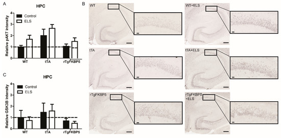 Early life stress increases phosphorylated AKT at Serine 473 (pAKTSer473) in the hippocampus. (A) Relative intensity of pAKTSer473 in the hippocampus (HPC) from WT = 6, tTA = 5, rTgFKBP5 = 5 mice and WT = 5, tTA = 5, rTgFKBP5 = 5 mice with ELS. (B) Representative images are shown. (C) GSK-3β levels in the HPC from the same mice. Interaction of stress and genotype was analyzed by two-way ANOVA followed by Bonferroni correction when significant (see Table 2). Values are represented as standard error of the mean (SEM) and relative protein expression is normalized to WT-control mice (represented by dotted lines). ELS = early life stress. Scale bar represents 200 µm; inset scale represents 20 µm. AKT = Protein kinase B.