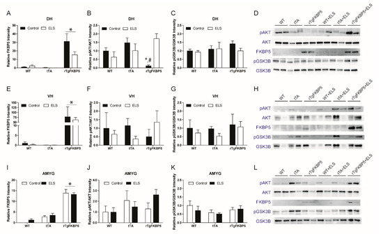 These procedures are described in more detail in our previous publication [1]. Briefly, one week after behavioral testing, 5-month-old mice were euthanized with a Somnasol overdose and transcardially perfused with 0.9% saline. In half of the cohort [Non-stressed control (WT= 6, tTA = 5, rTgFKBP5 = 5), ELS (WT= 5, tTA = 5, rTgFKBP5 = 5)], we collected the brains where the left hemisphere was transferred to 4% paraformaldehyde for overnight fixation and the right hemisphere was used to isolate brain structures. Free-floating 25 µm sections were used for immunohistochemical analysis. Tissue sections were incubated overnight with the following primary antibodies: anti-pAKTSer473 (CS-4060; 1:1000) and anti-GSK-3β (CS-9832; 1:1000). A Zeiss AxioScan.Z1 slide scanner (Zeiss, Oberkochen, Germany ) was used to image 20 x brightfield sections followed by tissue cytometry using the NearCYTE software (www.nearcyte.org).