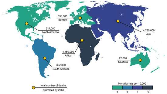 The estimated number of deaths at every continent in 2050 attributed to antimicrobial resistance (AMR). Image adapted from [].