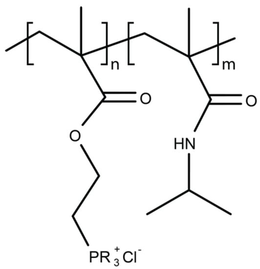 Polyphosphonium and polysulfonium are phospo- and sulfo- containing polymers, respectively (Figure 5). They share their mode of action with polymers comprising quaternary ammonium in causing damage to the bacterial cell wall. Phosphonium containing polycationic agents are typically considered to be more microbicidal than quaternary ammonium salt polymers with their antimicrobial potency positively related to the number of phosphonium units within the polymer []. Until recently, polyphosphoniums studies have been restricted to alkyl and aryl derivatives with the polymers exhibiting both hydrophobic and hydrophilic domains—a feature considered to be required for antimicrobial activity. Cuthbert and colleagues unexpectedly discovered that control polymers lacking hydrophobic alkyl chains exhibit high antimicrobial activity against E. coli and S. aureus while at the same time low lytic action on erythrocytes []. These findings were uncovered when investigating the ability of ‘baited’ phosphonium polymers to exert increased microbicidal effects, taking advantage of bacterial affinity to mannose sugars []. This work challenges the assumed requirement for balanced hydrophilic and lipophilic components within biocidal polymers and warrants further investigation into this promising class of antimicrobial polymers.