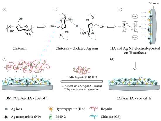 Studies have also moved towards the inclusion of additional materials to the AgNPs-polymer containing systems. An example is the incorporation of growth factors (bone morphology protein-2, BMP-2) and AgNPs into hydroxyapatite (HA) coatings on metallic implant surfaces for enhancing osteo-inductivity and antibacterial properties. In this complex system, BMP-2 and AgNPs containing HA coating were prepared on titanium (Ti) surfaces by electrochemical deposition (ED). In addition, chitosan (CS) was used as a stabilising agent for the generation of the AgNPs, and simultaneously reduced their toxicity. A schematic representation of this system is shown in Figure 7. Results of antibacterial tests indicated that the CS/Ag/HA coatings have high antibacterial properties against both S. epidermidis and E. coli. Additionally, bone marrow stromal cells (BMSCs) culture results indicated that the BMP/CS/Ag/HA coatings have good osteoinductivity and promote the differentiation of BMSCs. Implantation of Ti bars with BMP/CS/Ag/HA coatings into the femur of rabbits showed that BMP/CS/Ag/HA coatings favour bone formation in vivo. Other studies can be found in the literature reporting the inclusion of other biological or synthetic compounds into the AgNPs-polymers systems such as bovine serum albumin and tiopronin.