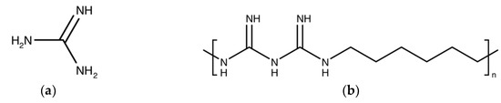 Guanidine-like compounds have been investigated for the past three decades and have given benefit in diverse medicinal field (Figure 10a) [,]. Guanidine can be found in natural terrestrial and marine environments such as microorganisms, plants and invertebrates []. Guanidine displays cationic properties and this allows for interaction with the anionic counterpart. The side chain diversity of guanidine allows for further development of guanidine scaffold for different therapeutic purposes []. Compounds containing guanidine have attracted interest and have been successfully applied as therapeutics for the central nervous system, anti-inflammatory agents, anti-thrombotic agents, anti-diabetic agents and antimicrobial agents []. One of the most commonly used antimicrobial polymers is polyhexamethylene biguanide (PHMB) or also known as polyhexanide (Figure 11). PHMB is synthesized by oligomirazation of guanidine salts and hexamethylenediaemine []. PHMB has been widely used in domestic applications, as an antiseptic in medicine, and in the food industry. PHMB applications include impregnation of wound dressings, water treatment, mouthwash and disinfection in contact lenses [,,].