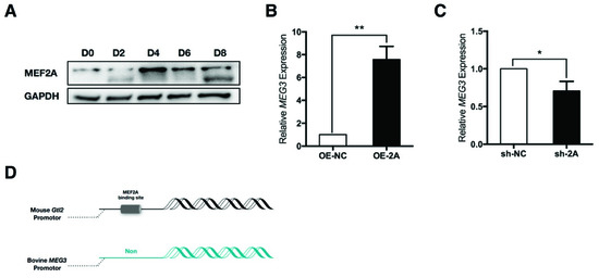 Myocyte enhancer factor 2A (MEF2A) is sufficient to induce maternally expressed 3 (MEG3) expression. (A) Time course of MEF2A protein expression from differentiation day 0 (D0) to differentiation day 0 (D8) of myoblasts; (B) Overexpression of MEF2A obviously induced MEG3 expression in differentiated myocytes; (C) Inhibition of MEF2A repressed MEG3 expression in differentiated myocytes; (D) Transcription factor binding motif prediction of the mouse Gtl2 promotor and bovine MEG3 promotor. Error bars represent standard error of the mean (SEM). “*” represents p < 0.05. “**” represents p < 0.01.