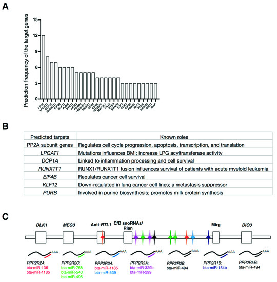 Identification of predicted target genes of the MEG3- iodothyronine deiodinase 3 (DIO3) miRNA cluster. (A) Prediction frequency of the genes potentially targeted by the miRNAs in the MEG3-DIO3 locus; (B) The top seven predicted targets of the MEG3-DIO3 miRNA cluster and their known roles in mammalian cells; (C) Target prediction diagrams of protein phosphatase 2A (PP2A) subunit genes by the MEG3-DIO3 miRNA cluster. A total of one scaffolding subunit gene and six regulatory subunit genes were predicted.