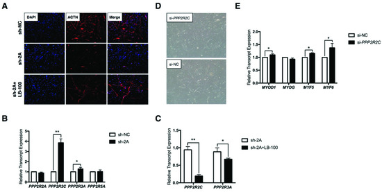 Myoblasts were cultured in 6-well cell culture plates and infected with sh-2A and sh-NC at multiplicity of infection (MOI) 50. The PP2A inhibitor LB-100 (Selleck, Shanghai, China) was added 24 h post infection of adenoviruses at a final concentration of 1 µM. Myoblasts were induced to myogenic differentiation for 6 days before microscopy and RT-PCR analysis.