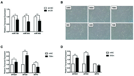MEF2A regulates MEG3-DIO3 miRNAs during myoblast differentiation. (A) RT-PCR analysis of miR-758, miR-543, and miR-495 in MEF2A-depleted myocytes; (B) Overexpression and inhibition effects of miR-758 and miR-543 on myoblast differentiation (magnification: 40×); (C) RT-PCR analysis of MYOD1, MYOG, and MYF5 upon miR-758 mimics transfection during myoblast differentiation; (D) RT-PCR analysis of MYOD1, MYOG, and MYF5 upon miR-543 mimics transfection during myoblast differentiation. Error bars represent SEM. “*” represents p < 0.05. “**” represents p < 0.01.