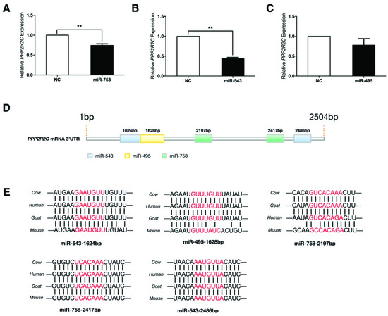 On the basis of the results obtained in this study, next the expression correlations between PPP2R2C and the three miRNAs were investigated. RT-PCR analysis showed that PPP2R2C expression was down-regulated in the presence of miR-758 mimics and miR-543 mimics (Figure 5A,B), while miR-495 had no effects on PPP2R2C expression (Figure 5C). To explore whether these miRNAs modulated PPP2R2C expression through post-transcriptional regulation, the 3′ untranslated region (3′UTR) of PPP2R2C mRNA was subjected to detailed analysis. As shown in Figure 5D, two miR-543 binding sites, two miR-758 binding sites, and one miR-495 binding site were predicted in the PPP2R2C 3′UTR. Subsequently, sequence alignments of the five miRNA binding sites were analyzed to determine the sequence conservation among mammals. The results showed that the miRNA binding sites of miR-543-1624bp, miR-758-2417bp, and miR-543-2486bp were completely conserved among cows, humans, goats, and mice (Figure 5E). The other two miRNA binding sites including miR-495-1628bp and miR-758-2197bp were less conserved when compared the transcriptome database between cows and mice (Figure 5E). Notably, among the five miRNA binding sites, miR-543-1624bp and miR-495-1628bp had an overlap of three nucleotides (GUU, red letters in Figure 5E), suggesting that in this region, there might be only one miRNA that could sufficiently bind to PPP2R2C mRNA. Taken together, these findings indicate that PPP2R2C might be post-transcriptionally regulated by miR-758, miR-543, and miR-495.