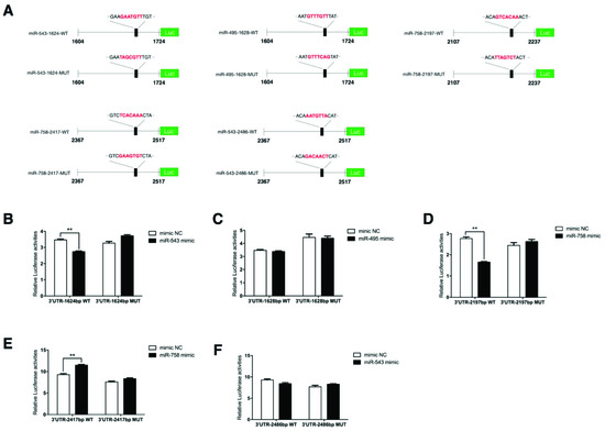 To investigate whether PPP2R2C was a downstream target of miR-758, miR-543, and miR-495, luciferase activity assays were introduced by using the psiCHECK-2 reporter vector. Ten reporter vectors containing the wide type (WT) or mutant (MUT) miRNA binding sites were generated and transfected together with the corresponding miRNA mimics in 293T cells (Figure 6A). The mutant miR-543-1624 and miR-495-1628 reporters were generated by mutating GAAT to TAGC and TGTT to TCAG, respectively, without altering the overlapping nucleotides GTT. Luciferase activity assays showed that three out of the five potential miRNA binding sites interacted with the miRNAs (Figure 6B–F). Activities of the WT 3′UTR-1624bp vector and the WT 3′UTR-2197bp vector were down-regulated in the presence of miR-543 mimics (Figure 6B) and miR-758 mimics (Figure 6D), respectively, while activity of the WT 3′UTR-2417bp vector was elevated in the presence of miR-758 mimics (Figure 6E). It is possible that this up-regulating effect might be achieved by unconventional miRNA functions [35]. For the other two remaining vectors containing the predicted miRNA binding sites 3′UTR-1628bp and 3′UTR-2486bp, miR-495 and miR-543 were not capable of regulating their activities (Figure 6C,F). These results suggest that PPP2R2C is a direct target of the MEG3-DIO3 miRNA cluster that can be regulated by miR-758 and miR-543.