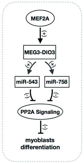 The potential roles of MEF2A-MEG3/DIO3-PP2A signaling regulatory axis in myoblast differentiation. That is, the MEG3-DIO3 miRNA cluster functions downstream of MEF2A to modulate PP2A signaling in myoblast differentiation. Black arrows and “(+)” represent positive regulation. T-bars and “(−)” represents negative regulation.