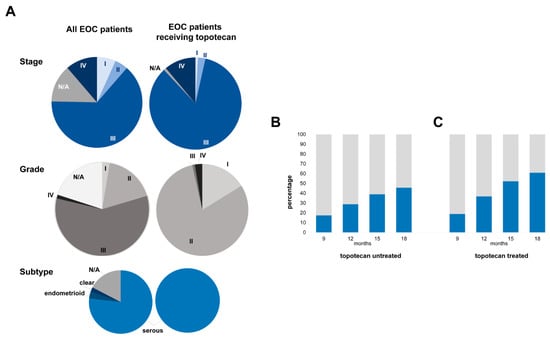 Patient characteristics including stage, grade and histological subtype across the entire epithelian ovarian cancer dataset and in the sub-cohort treated with systemic therapy including topotecan. (A) Proportion of responders (grey)/nonresponders (blue) to systemic chemotherapy including/excluding topotecan at the four progression free survival (PFS) cutoff times in topotecan-untreated (B) and -treated (C) patients.