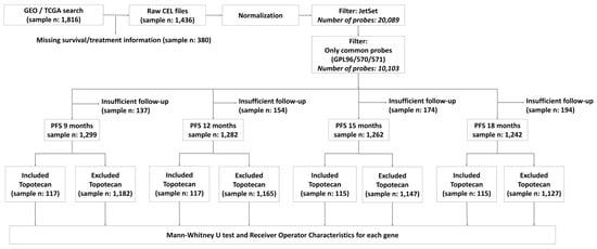 Information about gene expression for the 1436 patients was available for 10,103 unique genes. For each gene, the median expression was compared between responders and non-responders for each treatment type (chemotherapy including/excluding topotecan) with Mann–Whitney U test and receiver operator characteristics (ROC) at each progression-free survival (PFS) cutoff (9, 12, 15 and 18 months after surgery). Statistical significance was accepted in the case of p < 0.05 and fold change (FC) ≥ 1.44. Only genes with a mean expression above 600 were considered to be meaningful. The package “roc” was used to calculate the area under the curve (AUC) and significance [] (http://www.bioconductor.org).