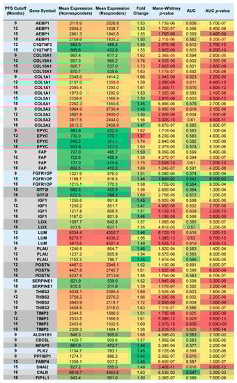 For 18 genes, the association between gene upregulation and subsequent disease progression held through multiple cutoff times, and for 9 genes (AEBP1, COL10A1, COL1A1, COL5A2, EPYC, FAP, IGF1, THBS2 and TIMP3), the association remained significant at all four PFS cutoffs between responders and nonresponders (Figure 3).