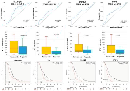 Four genes (EPB41L2, HLA-DQB1, LTF and SFRP1) were consistently overexpressed in initial tumor samples of subsequent nonresponders across multiple PFS cutoff times (Figure 5). High expressions of EPB41L2, HLA-DQB1, LTF and SFRP1 were persistently associated with significantly worse PFS among topotecan-treated EOC patients (Figure 5). There was no correlation in the expression of EPB41L2, HLA-DQB1, LTF and SFRP1 genes (Spearman’s rank correlation, p > 0.1). There was also no association between treatment response and different stages of EOC (χ2 test, p = 0.588).