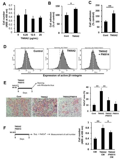 Cells (8.0 × 103 cells/well) were seeded on 96-well culture plates coated with fibronectin (1.0 μg/mL) and then cultured with medium in the presence or absence of peptide TNIIIA2, or CM prepared under various conditions. The number of viable cells was evaluated based on the WST-8 assay, as described previously [].