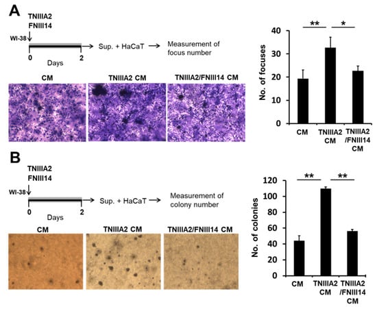 Peptide TNIIIA2-induced malignant progression in preneoplastic epithelial HaCaT cells. Conditioned medium from peptide TNIIIA2-stimulated WI-38 fibroblasts enhanced the proliferation/survival in preneoplastic epithelial HaCaT cells. In panels (A) and (B), WI-38 cells were treated for 2 days in the absence or presence of peptide TNIIIA2 (25 μg/mL) and peptide FNIII14 (50 μg/mL), respectively, and the culture supernatants were collected as conditioned medium, as described in the legend of Figure 2F. Preneoplastic HaCaT cells were subjected to the focus formation assay (A) or colony formation assay (B) using these conditioned media, as described in the “Materials and Methods”. Data represent the means ± standard deviation of triplicate determinations, * p < 0.05, ** p < 0.01.