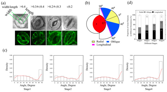 In order to further understand the arrangement of actin filaments relative to stomatal apertures, we divided stomata into four stages during diurnal cycle based on the values of stomatal apertures. Among them, the Stage 1 stomata with the ratio of width/length greater than 0.4; the Stage 2 stomata with the ratio of width/length between 0.3–0.4; the Stage 3 stomata with the ratio of width/length between 0.2–0.3; and the Stage 4 stomata with the ratio of width/length was equal or less than 0.2 (Figure 2a). Then we measured the angles of each filament using GCMA program. The histogram distribution of the values of angles of actin filaments within guard cell showed that values of angles of actin filaments are mainly in the range of 0–40 degrees, and the actin array mainly showed a radial arrangement in Stage 1 stomata (Figure 2a,c). With the decrease in stomatal aperture, the proportion of single filaments with the value of angle at 90 degrees increased, and the peak value of angles gradually shifted from 0–40 degrees to 30–40 degrees at Stage 3, which indicated that the proportion of actin filaments in radial distribution decreased. At Stage 4, the proportion of 90-degree filaments further increased, and the peak value of angles of actin filaments was at 40–50 degrees, indicating that the proportion of longitudinal filaments increased with the decrease in stomatal aperture (Figure 2c). These results indicated that the amount of longitudinally oriented actin filaments increases during the closing of stomata.