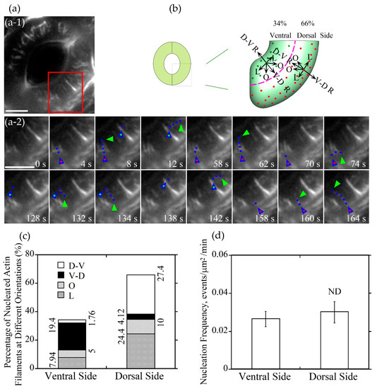 Figure 4. Actin nucleation occurs at both of dorsal side and ventral side of guard cells, and the majority of them elongated along the longitudinal orientation in closed stomata. (a) Dynamics of actin nucleation and elongation of single actin filaments in guard cell of closed stomata in wild type (WT). (a-1) Overview of the closed stomata expressing GFP-ABD2-GFP, the red box marked the region of interest. (a-2) An enlarged view of time-lapse images of actin nucleation and elongating direction in the region of interest in (a-1). Blue triangles with red dot inside indicate the nucleation sites or the starting points of the elongating actin filaments in the dorsal side of guard cells, and blue triangles with green dot inside indicate the nucleation sites or the starting points of the elongating actin filaments in the ventral side of guard cells. Blue dots indicate the elongating actin filaments. Green triangles indicate the newly elongated direction of actin filaments. Bar = 5 μm. (b) Schematic diagram describing actin filaments of different orientations (D-V R, dorsal-to-ventral radial; V-D R, ventral-to-dorsal radial; O, oblique; L, longitudinal) in the dorsal side and ventral side of guard cells in closed stomata. The dotted pink line is the boundary between dorsal region and ventral region of the guard cell. Red and green dots represent actin nucleation sites in dorsal and ventral region of the guard cell, respectively. Arrows indicate the direction of the elongation of the actin filaments. (c) The proportion of actin filaments of each orientation (D-V R, dorsal-to-ventral radial; V-D R, ventral-to-dorsal radial; O, oblique; L, longitudinal) in the dorsal side and ventral side of guard cells in closed stomata. (d) Nucleation frequency per unit area showed no significant difference between dorsal side and ventral side of guard cell in closed stomata. ND, no significant difference. See Supplemental Movie 2 online for the entire series in (a). Bar = 5 μm.
