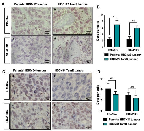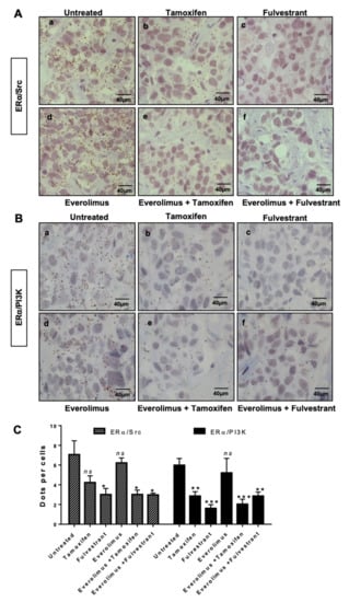 - Poulard, C.; Rambaud, J.; Le Romancer, M.; Corbo, L. Proximity Ligation Assay to Detect and Localize the Interactions of ERα with PI3-K and Src in Breast Cancer Cells and Tumor Samples. Methods Mol. Biol. 2014, 1204, 135–143. [Google Scholar]