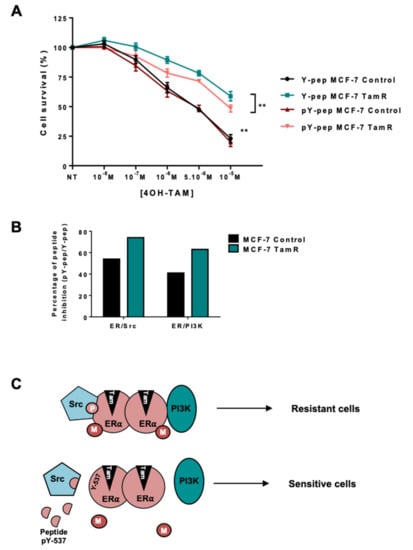 - Varricchio, L.; Migliaccio, A.; Castoria, G.; Yamaguchi, H.; De Falco, A.; Di Domenico, M.; Giovannelli, P.; Farrar, W.; Appella, E.; Auricchio, F. Inhibition of Estradiol Receptor/Src Association and Cell Growth by an Estradiol Receptor Tyrosine-Phosphorylated Peptide. Mol. Cancer Res. 2007, 5, 1213–1221. [Google Scholar] [CrossRef]