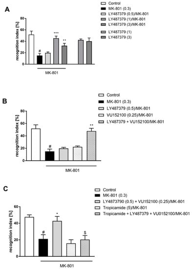 Novel object recognition test in mice. Effectivity of LY487379 (A), combined administration of sub-effective doses of LY487379 and VU152100 (B), and the blockade of combination’s effect by M4 receptor antagonist Tropicamide (C). Compounds and MK-801 were administered acutely, as shown in Figure 1. Investigated doses are indicated in parentheses. Bars represent the means ± SEM. N = 8–10/group. # p < 0.001 versus the control group; * p < 0.05 and ** p < 0.01 versus the MK-801-treated group; $ p < 0.0001 versus the LY487379 + VU152100 group.