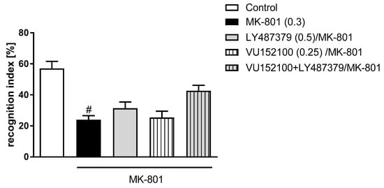 Novel object recognition test in mice after chronic administration (7 days) of investigated compounds in acute MK-801 model. Investigated doses are indicated in parentheses. Bars represent the means ± SEM. N = 8–10/group. # p < 0.001 versus the control group.