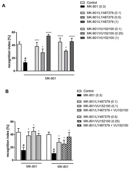 Novel object recognition test in mice after chronic administration (7 days) of MK-801. Effectivity of LY487379 and VU152100 administered alone (A), and combined administration of low doses of LY487379 and VU152100 (B). Compounds were administered acutely 30 min before the test. Investigated doses are indicated in parentheses. Bars represent the means ± SEM. N = 8–10/group. # p < 0.001 versus the control group; * p < 0.05 and *** p < 0.001 and **** p < 0.0001 versus the MK-801-treated group.