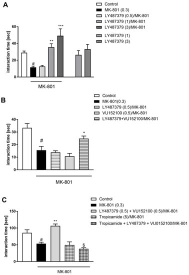 Social interaction test in mice. Effectivity of LY487379 (A), combined administration of sub-effective doses of LY487379 and VU152100 (B), and the blockade of the combination’s effect by M4 receptor antagonist Tropicamide (C). Compounds and MK-801 were administered acutely as shown on Figure 1. The investigated doses are indicated in parentheses. Bars represent the means ± SEM. N = 8–10/group. # p < 0.001 versus the control group; * p < 0.05, ** p < 0.01 and *** p < 0.001 versus the MK-801-treated group; $ p < 0.0001 versus the LY487379 + VU152100 group.
