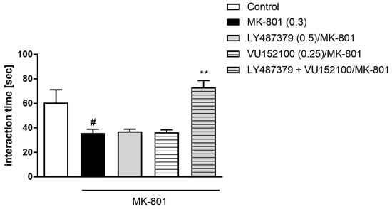 Social interaction test in mice after chronic administration (7 days) of investigated compounds in acute MK-801 model. Investigated doses are indicated in parentheses. Bars represent the means ± SEM. N = 8–10 pairs/group. # p <0.001 versus the control group and ** p < 0.01 versus LY487379 or VU152100.