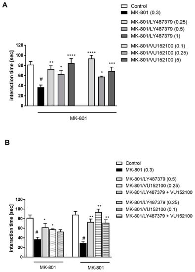 Administration of MK-801 (0.3 mg/kg) for 7 days induced deficits in social interactions, observed 24 h after the last injection (Figure 7). LY487379 was administered at 0.25, 0.5 and 1 mg/kg doses, and VU152100 was administered at 0.1, 0.25 and 5 mg/kg doses. The compounds treated MK-801-induced deficits at all administered doses. One-way ANOVA revealed a significant effect of the compounds, F(3.21) = 10.32; p < 0.0002 and F(3.22) = 20.53; p < 0.0001, respectively (Figure 7A). Simultaneous administration of low doses of both compounds did not enhance their individual effectiveness to treat MK-801-induced deficits (Figure 7B).