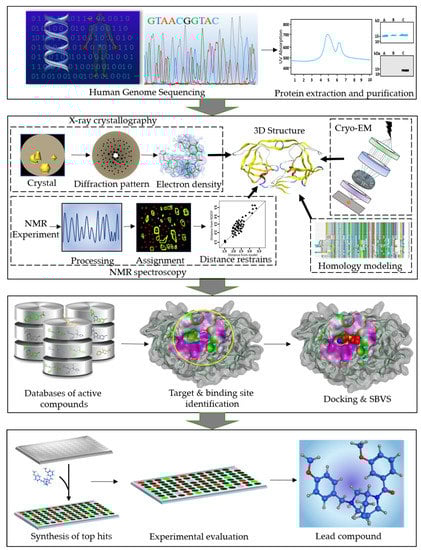 The basic step in a typical SBDD process is target protein identification and validation [29]. The 3D structures of all therapeutically important proteins are determined experimentally by integrative structure biology techniques such as: NMR, X-ray crystallography, or cryo-electron microscopy but if a solution structure is not available, in silico methods are used to model the protein’s 3D structure. There are three well-known structure prediction methods such as comparative modeling, threading, and ab initio modeling. Among them, homology modeling is one of the best and reliable approaches because it predicts the 3D structure of a target protein on the basis of the knowledge about the structure of homologous proteins with >40% similarity [2]. Once the 3D structure of the target is predicted, it is necessary to validate the model by checking the stereochemical properties in a Ramachandran plot. It shows the possible conformations of ψ and φ angles for all amino acid residues present in the protein structure [30]. There are many other methods for validation of the model [2,31,32].