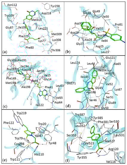 The interaction diagram of drugs identified by SBDD methods, with their respective therapeutic targets. (a) An interaction of raltitrexed with thymidylate synthase (Protein Data Bank (PDB) ID: 5X5Q). (b) An interaction of amprenavir with HIV protease (PDB ID: 3EKV). (c) Isoniazid, a drug for tuberculosis, identified by the SBVS method (PDB ID: 1ENY). (d) Pim-1 kinase inhibitor, benzofuropyrimidine, for the treatment of various types of cancers (PDB ID: 4ALU). (e) Epalrestat is an aldose reductase inhibitor (PDB ID: 4JIR). (f) Flurbiprofen is a cyclooxygenase 2 inhibitor (PDB ID: 3PGH).