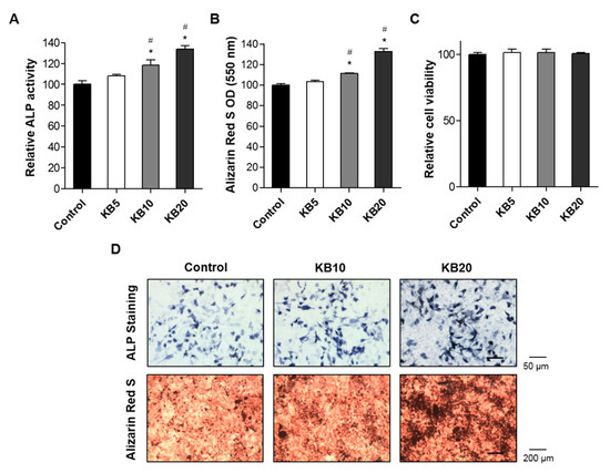 Preosteoblast MC3T3-E1 cells were cultured in a 48-well plate overnight and treated with 50 μg/mL of ascorbic acid and 10 mM of β-glycerophosphate with or without treatment with KB (10 and 20 μM) for three weeks. The cells were fixed with cold 70% ethanol for 10 min at room temperature and washed with water. Calcium deposits in the mineralized cells were determined by alizarin red S (Sigma-Aldrich) staining. Positive alizarin red S staining was determined using a light microscope. To quantify this, stained cells were extracted with 10% cetylpyridinium chloride for 1 h and transferred into a 96-well plate. The absorbance of the extracts was measured at a wavelength of 550 nm (BIO-RAD; Hercules, CA, USA).