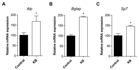 To further confirm the effects of KB on the cellular differentiation of osteoblasts, the expression of osteoblastic markers, including Alpl, Bglap, and Sp7, was investigated. Osteoblastic MC3T3-E1 cell lines were treated with 20 μM of KB. After treatment with KB, the mRNA expressions of Alpl, Bglap, and Sp7 were measured by quantitative reverse-transcription polymerase chain reaction (qRT-PCR). Significantly increased expressions of Alpl, Bglap, and Sp7 were observed in KB-treated cells compared to the control (Figure 3). These results suggested that KB promoted the up-regulation of the mRNA expressions of Alpl, Bglap, and Sp7.