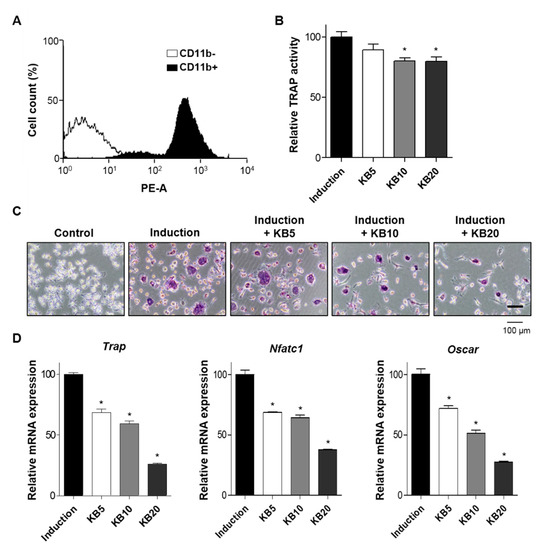 The imbalanced regulation of the bone-remodeling process promotes abnormal metabolic bone diseases, especially osteoporosis [1]. Osteoporosis, particularly for postmenopausal women, increases the bone resorption process because osteoclast differentiation occurs instead of bone formation, resulting in an enhanced risk of bone fragility and fractures [39]. To examine the effects of KB on bone resorption, this study investigated whether KB promoted the cellular differentiation of osteoclast cells isolated from the bone marrows of six-week-old mice. Monocytes from mouse bone marrow were successfully isolated and confirmed by a fluorescence-activated cell sorting (FACS) analysis with monocyte-specific surface markers (CD11b antibody) (Figure 4A). Monocytes are capable of osteoclast differentiation under a suitable microenvironment [40]. For the differentiation of primary-cultured monocytes to osteoclasts, cells were treated with macrophage colony-stimulating factor-1 (M-CSF) and RANKL. During a period of osteoclast differentiation, the treatment of KB did not affect the cell viability of primary-cultured monocytes of mouse bone marrow (Figure S5). After the induction of osteoclast differentiation of the primary-cultured monocytes, cells were treated with KB (5, 10, and 20 μM) for three and six days, and were analyzed by a TRAP activity assay and TRAP staining. The results showed that KB (10 and 20 μM) treatments significantly decreased TRAP activity and TRAP-positive staining colonies (Figure 4B,C and Figure S6). Next, we investigated the effects of KB on the expression of osteoclastic markers, such as tartrate-resistant acid phosphatase (Trap), nuclear factor of activated T cells cytoplasmic 1 (Nfatc1), and osteoclast-associated immunoglobulin-like receptor (Oscar). After treatment with KB (5, 10, and 20 μM), mRNA expressions of Trap, Nfatc1, and Oscar were assessed by qRT-PCR. KB significantly decreased the expressions of these osteoclast differentiation-related genes, compared to the non-treated control (Figure 4D). These results indicated that KB inhibited the osteoclast differentiation of monocytes from bone marrow.
