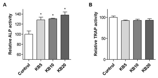 Bone remodeling is regulated by two processes: Bone formation by the differentiation of osteoblasts, and bone resorption by the differentiation of osteoclasts in the surface of the bone [32]. The relationship between bone formation and bone resorption includes the interaction of various cell types during bone remodeling [41,42]. Osteoclast and osteoblast cells communicate with each other through gap junctions [41]. The effects of KB on bone formation under the more closely physiological conditions of a co-culture system of preosteoblast MC3T3-E1 cells and primary-cultured monocytes were investigated. Previous studies suggested that a co-culture system containing both bone-forming cells (osteoblasts) and bone-resorbing cells (osteoclasts) more closely mimicked the in vivo environment as a cytocompatibility assessment in vitro for bone remodeling [43,44,45]. Consequently, a co-culture system of preosteoblasts and preosteoclasts was established. The osteoblast differentiation of co-cultured cells was induced by the treatment of ascorbic acid and β-glycerophosphate for three or six days, and the effects of co-treated KB (5, 10, and 20 μM) on osteoblast and osteoclast differentiations were examined. KB treatment increased ALP activity compared to the non-treated control cells, and a higher ALP activity was observed at three days of KB treatment compared to at six days (Figure 5A and Figure S7A). However, KB did not influence TRAP activity in a co-cultured system at either three or six days of incubation (Figure 5B and Figure S7B).